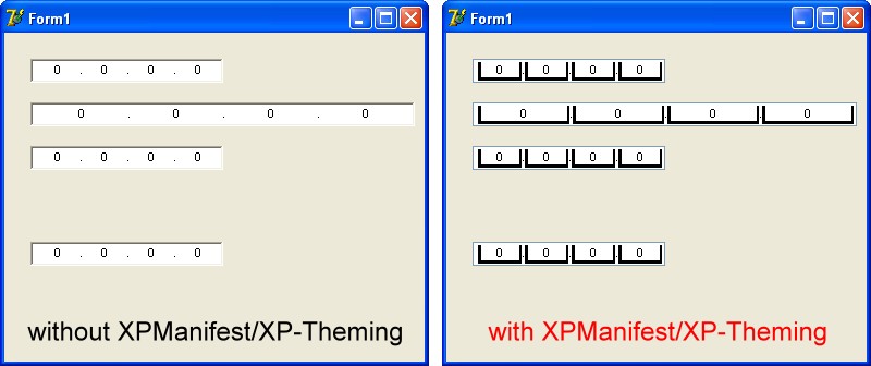 | Description | Compiler: D7 Pro OS: WinXP Pro When you use an XPManifest component and put an TJvIPAddress component on the same form. Then you can see a themed TJvIPAddress field but with strange black thick lines around each number. (see screenshot) When you use the form without the XPManifest/XP-Theming then the IP edit field seems to be ok. Hope somebody could fix this bug! | ||||
