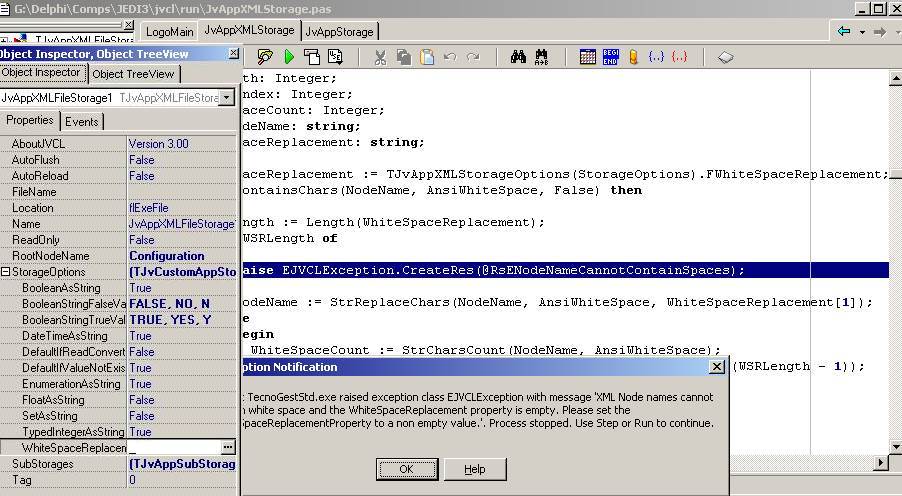 | Description | Hi all I used, before JVC 3.00 RC1 version, an XML file to save the Form propierties of my app. I used a JvAppXMLStorage comp. connected with a JvAppStorage, and works fine. I have downloaded the version of Jedi of sourceforge (JVCL 3.00 RC 1 2005-01-08) and found the following problems: 1.- JvAppXMLStorage.WhiteSpaceReplacement has changed into StorageOptions, is OK. BUT, it cannot be accesible by code, only with the Inspector. So I cannot assign a value by code to this propierty. (before I assigned by code the values of jVAppXMLStorage). 2.- When I assign a value to this propierty WhiteSpaceReplacement=> '_' in the Inspector and run my app, I have the following exception "XML nodes cannot contain white space and the WhiteSpaceReplacement propierty is empty. Please set the WhiteSpaceReplacement propierty to a non empty value" BUT, this is not true, if i see the propierty in my app. it has the value '_'. I think is there a problem when the changes in this propierty. | ||||