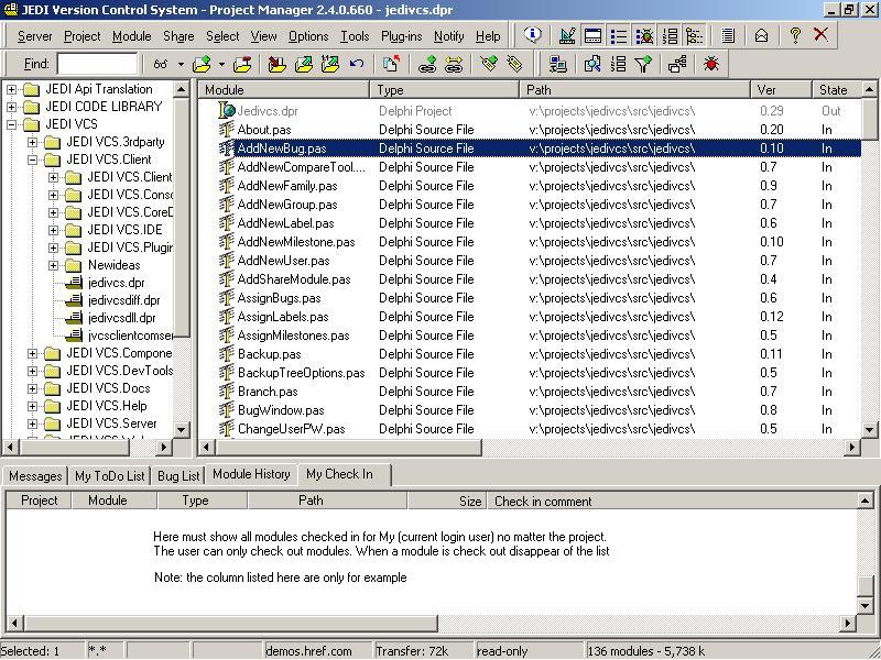 | Description | A important feature to implement can be add a tabsheet in project admin for the bottom pagecontrol (when Message, Module History, etc). This tabsheet should be a list with all "check in" modules for my (current login user) no matter the project. Of course in the list must be show, by example: Project, module, path, version, etc. and the only action to do is Check out. This feature is very useful when a programmer is working in several project in the same time. I hope be clear. (I attach a screenshoot) | ||||