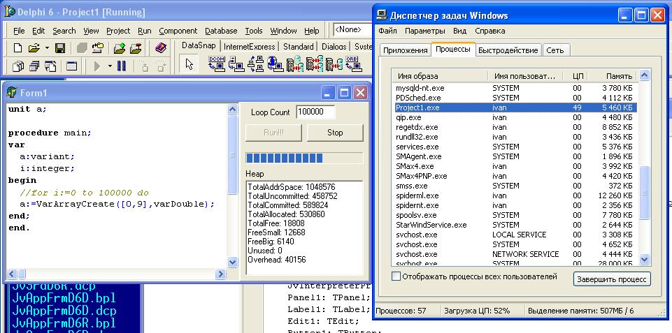 This is a possibility. There is however certainly a bug somewhere, as eventually the system runs out of memory and the program crashes. It could be that the bug is in Windows. Interestingly on one of the systems I tested, there was no problem. It was an Athlon XP with Windows XP professional service pack 2 and Delphi 7. I also tested it on 4 systems with Pentium 4, Windows XP professional service pack 1 and Delphi 6. All these had the problem. The problem occured with both the default memory manager and fastmm. Also the problem occurs only when we use JvInterpreter. We use lots of other programs and never experienced any such behavior. There must be something in JvInterpreter that triggers it. |