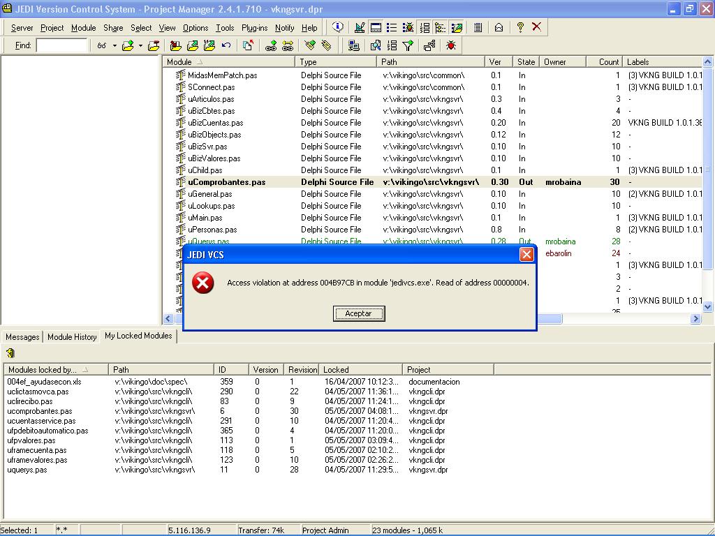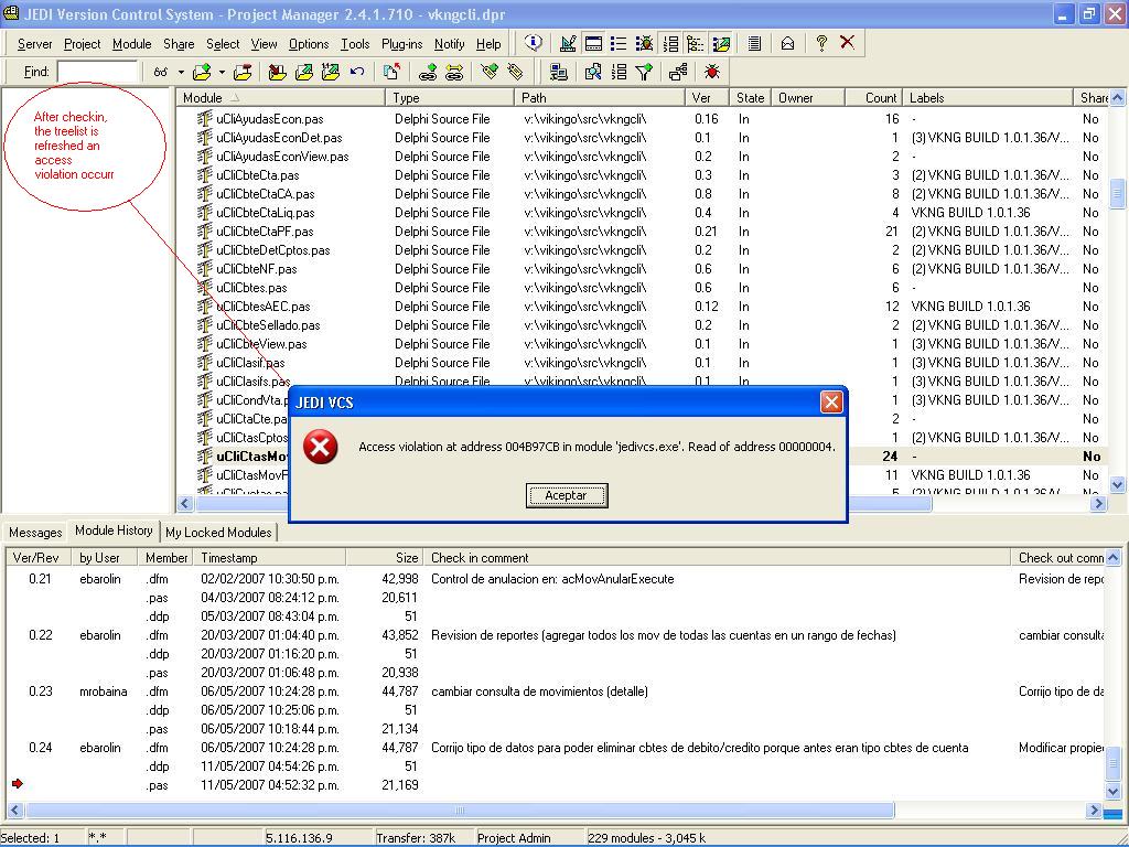 | Description | Before check out a module, an access violation exception is raised. This occurr sometimes in the new JediVCS GUI client 2.4.1.710. I attach a screenshoot for any help. | ||||