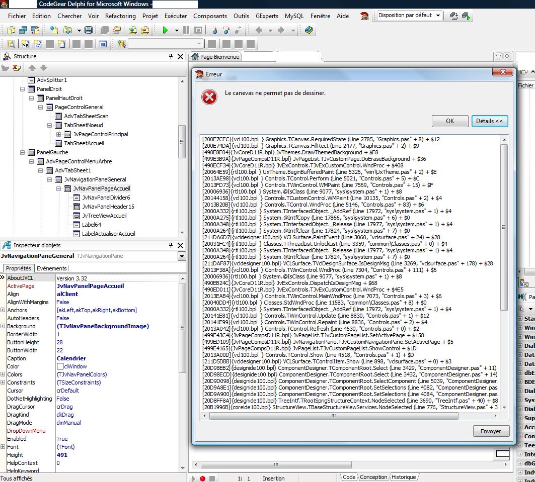 I have the same problem (Vista with Aero) on version 3.31 and 3.32. When Aero is off there is no problem. It happens when we change the ActivePage on both CodeGear 2007 IDE and compiled application. error : [200E7CFC]{vcl100.bpl } Graphics.TCanvas.RequiredState (Line 2785, "Graphics.pas" + 8) + $12 [200E74DA]{vcl100.bpl } Graphics.TCanvas.FillRect (Line 2477, "Graphics.pas" + 2) + $9 [490E8F04]{JvCoreD11R.bpl} JvThemes.DrawThemedBackground + $F8 [499E3B9A]{JvPageCompsD11R.bpl} JvPageList.TJvCustomPage.DoEraseBackground + $36 [490ECF34]{JvCoreD11R.bpl} JvExControls.TJvExCustomControl.WndProc + $408 [20064E59]{rtl100.bpl } UxTheme.BeginBufferedPaint (Line 5326, "win\UxTheme.pas" + 2) + $E [2013AE98]{vcl100.bpl } Controls.TControl.Perform (Line 5021, "Controls.pas" + 5) + $C [2013FD73]{vcl100.bpl } Controls.TWinControl.WMPaint (Line 7569, "Controls.pas" + 15) + $F [20006936]{rtl100.bpl } System.@IsClass (Line 9077, "sys\system.pas" + 1) + $8 [20144158]{vcl100.bpl } Controls.TCustomControl.WMPaint (Line 10135, "Controls.pas" + 2) + $4 [2013B20B]{vcl100.bpl } Controls.TControl.WndProc (Line 5146, "Controls.pas" + 83) + $6 [2000A332]{rtl100.bpl } System.TInterfacedObject._AddRef (Line 17972, "sys\system.pas" + 1) + $4 [2000A275]{rtl100.bpl } System.@IntfCopy (Line 17866, "sys\system.pas" + 6) + $0 [2000A348]{rtl100.bpl } System.TInterfacedObject._Release (Line 17977, "sys\system.pas" + 1) + $4 [2000A264]{rtl100.bpl } System.@IntfClear (Line 17824, "sys\system.pas" + 7) + $0 [211DA6D7]{vcldesigner100.bpl} VCLSurface.PaintEvent (Line 3060, "vclsurface.pas" + 24) + $28 [20031FC4]{rtl100.bpl } Classes.TThreadList.UnlockList (Line 3359, "common\Classes.pas" + 0) + $4 [2000A348]{rtl100.bpl } System.TInterfacedObject._Release (Line 17977, "sys\system.pas" + 1) + $4 [2000A264]{rtl100.bpl } System.@IntfClear (Line 17824, "sys\system.pas" + 7) + $0 [211DAF87]{vcldesigner100.bpl} VCLSurface.TVclDesignSurface.IsDesignMsg (Line 3269, "vclsurface.pas" + 178) + $28 [2013F38A]{vcl100.bpl } Controls.TWinControl.WndProc (Line 7304, "Controls.pas" + 111) + $6 [20006936]{rtl100.bpl } System.@IsClass (Line 9077, "sys\system.pas" + 1) + $8 [490EB24C]{JvCoreD11R.bpl} JvExControls.DispatchIsDesignMsg + $68 [490ED011]{JvCoreD11R.bpl} JvExControls.TJvExCustomControl.WndProc + $4E5 [2013EAB4]{vcl100.bpl } Controls.TWinControl.MainWndProc (Line 7073, "Controls.pas" + 3) + $6 [20040DD4]{rtl100.bpl } Classes.StdWndProc (Line 11583, "common\Classes.pas" + 8) + $0 [2000A332]{rtl100.bpl } System.TInterfacedObject._AddRef (Line 17972, "sys\system.pas" + 1) + $4 [20141E81]{vcl100.bpl } Controls.TWinControl.Update (Line 8830, "Controls.pas" + 1) + $12 [20141E99]{vcl100.bpl } Controls.TWinControl.Repaint (Line 8836, "Controls.pas" + 2) + $4 [2013A042]{vcl100.bpl } Controls.TControl.Refresh (Line 4530, "Controls.pas" + 0) + $2 [499E43C4]{JvPageCompsD11R.bpl} JvPageList.TJvCustomPageList.SetActivePage + $158 [499ED109]{JvPageCompsD11R.bpl} JvNavigationPane.TJvCustomNavigationPane.SetActivePage + $5 [499E4165]{JvPageCompsD11R.bpl} JvPageList.TJvCustomPageList.ShowControl + $1D [2013A00D]{vcl100.bpl } Controls.TControl.Show (Line 4518, "Controls.pas" + 1) + $D [211D5DBB]{vcldesigner100.bpl} VCLSurface.TControlItem.Show (Line 898, "vclsurface.pas" + 0) + $3 [20D98EB2]{designide100.bpl} ComponentDesigner.TComponentRoot.Select (Line 3429, "ComponentDesigner.pas" + 11) + $5 [20D98ECD]{designide100.bpl} ComponentDesigner.TComponentRoot.Select (Line 3432, "ComponentDesigner.pas" + 14) + $B [20D9D098]{designide100.bpl} ComponentDesigner.TComponentRoot.SelectComponent (Line 5039, "ComponentDesigner.pas" + 0) + $0 [20D9A8E1]{designide100.bpl} ComponentDesigner.TComponentRoot.SetSelections (Line 4082, "ComponentDesigner.pas" + 7) + $13 [20D9A900]{designide100.bpl} ComponentDesigner.TComponentRoot.SetSelections (Line 4084, "ComponentDesigner.pas" + 9) + $B [20D8FF8A]{designide100.bpl} TreeIntf.TRootSprigStructureContext.NodeSelected (Line 3690, "TreeIntf.pas" + 40) + $8 [20B1996B]{coreide100.bpl} StructureView.TBaseStructureViewServices.NodeSelected (Line 776, "StructureView.pas" + 3) + $A [20B1B6A2]{coreide100.bpl} StructureView.TStructureViewForm.VirtualStringTree1Change (Line 1451, "StructureView.pas" + 14) + $15 [20EC6B82]{vclide100.bpl} IDEVirtualTrees.TBaseVirtualTree.DoChange (Line 17955, "idevirtualtrees.pas" + 3) + $A [20EC5AD2]{vclide100.bpl} IDEVirtualTrees.TBaseVirtualTree.Change (Line 17124, "idevirtualtrees.pas" + 8) + $6 [20EC51BA]{vclide100.bpl} IDEVirtualTrees.TBaseVirtualTree.AddToSelection (Line 16762, "idevirtualtrees.pas" + 7) + $6 [20ECB4CF]{vclide100.bpl} IDEVirtualTrees.TBaseVirtualTree.HandleMouseDown (Line 20727, "idevirtualtrees.pas" + 199) + $7 [20EC431D]{vclide100.bpl} IDEVirtualTrees.TBaseVirtualTree.WMLButtonDown (Line 16177, "idevirtualtrees.pas" + 6) + $8 [2013B20B]{vcl100.bpl } Controls.TControl.WndProc (Line 5146, "Controls.pas" + 83) + $6 [20EBCC5F]{vclide100.bpl} IDEVirtualTrees.TVTHeader.InHeader (Line 11017, "idevirtualtrees.pas" + 8) + $D [20EBC440]{vclide100.bpl} IDEVirtualTrees.TVTHeader.HandleMessage (Line 10696, "idevirtualtrees.pas" + 278) + $8 [2013F38A]{vcl100.bpl } Controls.TWinControl.WndProc (Line 7304, "Controls.pas" + 111) + $6 [20031FC4]{rtl100.bpl } Classes.TThreadList.UnlockList (Line 3359, "common\Classes.pas" + 0) + $4 [200EBA24]{vcl100.bpl } Graphics.FreeMemoryContexts (Line 5031, "Graphics.pas" + 12) + $5 [2013EE3C]{vcl100.bpl } Controls.TWinControl.IsControlMouseMsg (Line 7176, "Controls.pas" + 9) + $25 [2013F38A]{vcl100.bpl } Controls.TWinControl.WndProc (Line 7304, "Controls.pas" + 111) + $6 [20ECEB3A]{vclide100.bpl} IDEVirtualTrees.TBaseVirtualTree.WndProc (Line 23132, "idevirtualtrees.pas" + 32) + $4 [2013EAB4]{vcl100.bpl } Controls.TWinControl.MainWndProc (Line 7073, "Controls.pas" + 3) + $6 [20040DD4]{rtl100.bpl } Classes.StdWndProc (Line 11583, "common\Classes.pas" + 8) + $0 [201622A9]{vcl100.bpl } Forms.TApplication.StopHintTimer (Line 8669, "Forms.pas" + 3) + $6 [201611EC]{vcl