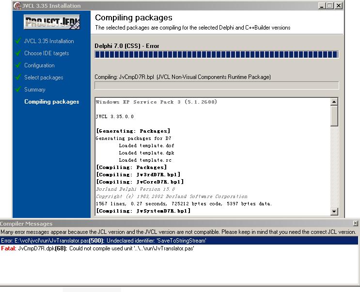 | Description | winxp sp3 + D7 + Daily 2008-8-25 jcl/jvcl. Error when install Daily jvc-l2008-8-25 [Error] JvTranslator.pas(500): Undeclared identifier: 'SaveToStringStream' | ||||