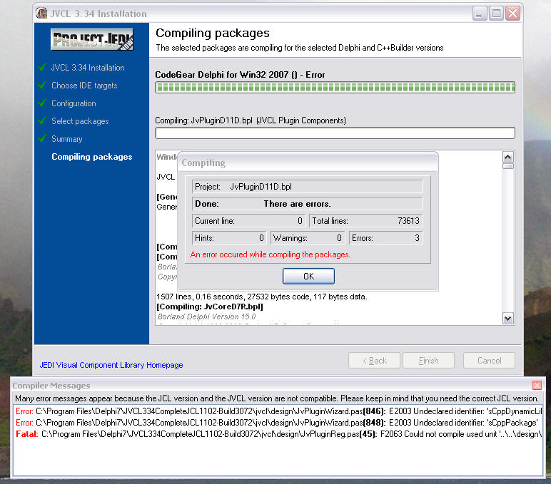 | Summary | 0004511: Installation in Delphi 2007 gives compiling error message compiling JvPluginD11D.bpl | ||||