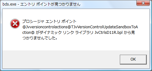 The message shows "Procedure entry point @Jvversioncontrolactions@TJvVersionControlUpdateSandboxToAction@ is not found in JvCtrlsD11R.bpl."