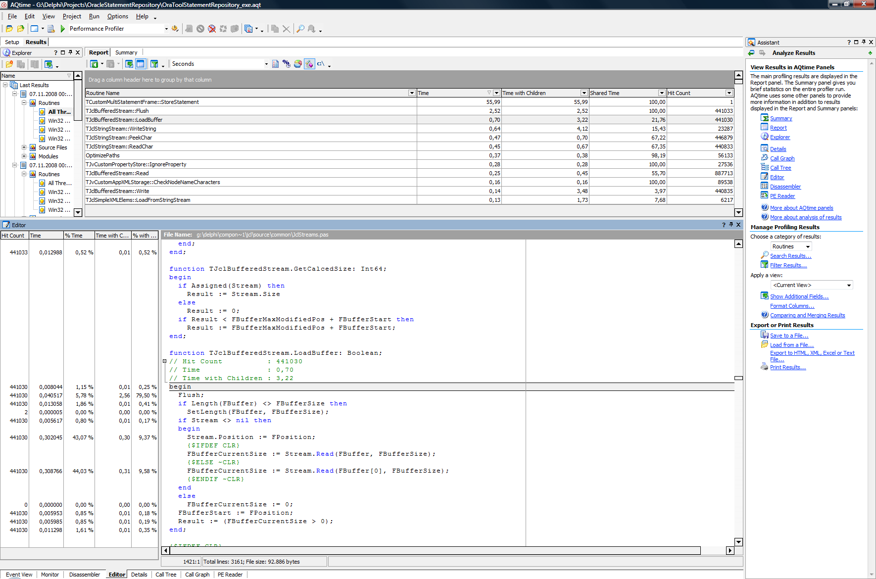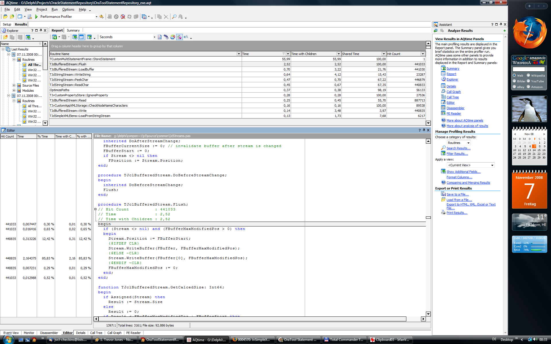For the situation Delphi 2007 + Ansi Encoding TJclStringStream.PeekChar and TJclStringStream.ReadChar consume almost all of the time. I compared the reading speed of the current revision (2514) with revision 2293 and it is 3 times slower. With a very simple version of PeekChar and ReadChar (just read a byte + Chr) it was faster then revision 2293. |