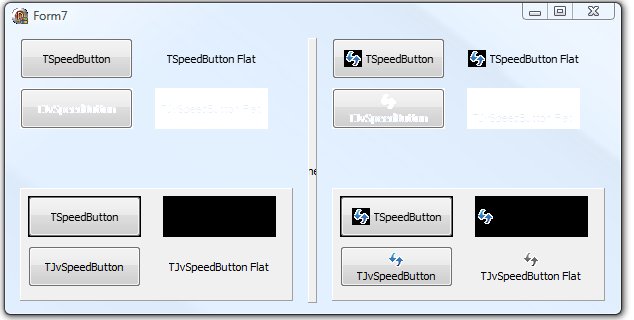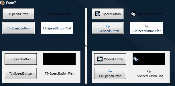 (sidenote: the text in this box is cleared after you upload a file) Sorry I was a little wrong in my explanation. The problem actually happens while not inside a container. I have included 2 screenshots comparing different scenarios with a normal TSpeedButton and a TJvSpeedButton. The second screenshot has the window maximized. I have also included a project for you to reproduce this issue. It seems like TSpeedButton displays fine on a form but not on a panel/container, and TJvSpeedButton has the opposite behaviour. In the case of using a glyph, TSpeedButton fails in both cases. |