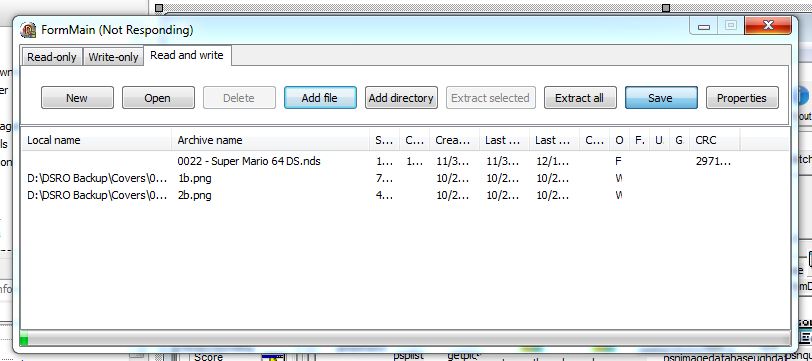 Well received. But I cannot reproduce the freeze here using 7z 9.16. Here are the steps I did: - save the 3 rar archive parts; - extract them; - compile the latest development version of the JCL (daily zips at http://jcl.sf.net/daily or SVN) - compile the ArchiveDemo project in jcl/examples/windows/compression/archive - open it - switch to the tab "read and write" - open the archive "0022 - Super Mario 64 DS.zip" - add several files 1a.png, ... - click on "Save" The compression runs as expected. System is windows 2k. Note that in your code, you could avoid multiple typecasts by declaring imageArchive as TJclUpdateArchive. |
