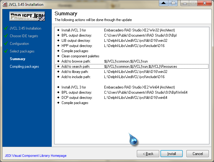 The JVCLInstaller has code to protect itself from broken IDE library paths. This is done by calling the compiler with "-U$(BDS)\lib" to make it always the first directory the compiler looks into. Unfortunately this was broken with Delphi XE due to the new directory structure. The unit directory is now $(BDS)\lib\win32\release, but the Installer still adds the $(BDS)\lib. For Delphi XE this doesn't break the Installer (unless you removed the $(BDS)\lib\win32\release directory from your IDE library paths). But with Delphi XE2 there is also the Win64 platform and it now depends on how much your IDE library path is messed up. I have fixed the Installer for Delphi XE and XE2 (and newer version until the directory structure will be changed again, but then you get an exception that I added). Fixed in svn revision 13148. |