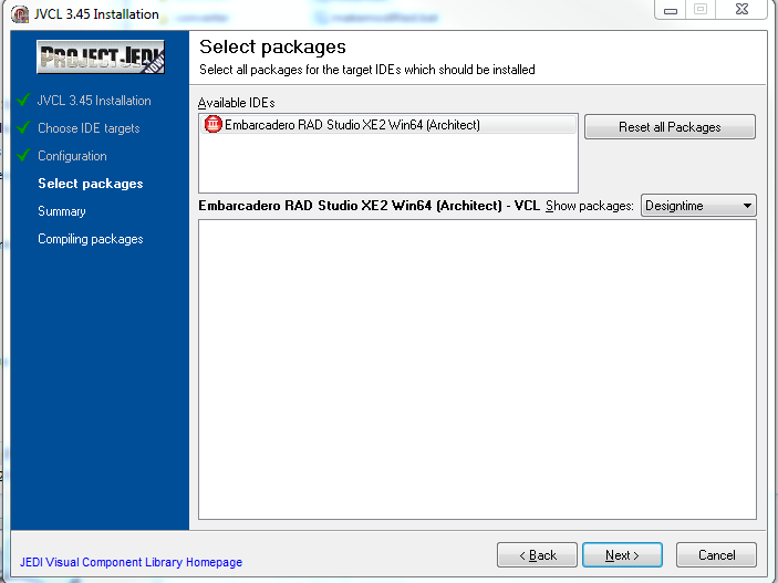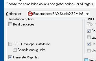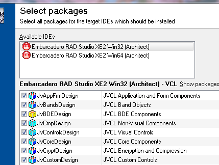 Would this file suit u ? It has JvLabel, JvMemo, JvCheckbox and JvFileEditbox ..... > The thing is, the installer doesn't even show the components to be installed when picking 64bit 1) why do u pick 64 bit insstead of 32-bit plus 64-bit ? 2) do u select Design-time packages only instead of both runtime and designtime packages in installer ? your screenshot is cut off, but u can see the field on one of mine. 3) do u understand difference between designtime and runtime packages ? did u opened packages of any library to read thesources and see the differenes? did u read Delphi documentation about packages, what they intended to be and why they are split to runtime and designtime ones ? 4) in particular, do u understand that designtime packages do NOT contain any components ? while technically possible, it only makes sense for fake components like MCK for KOL. And that questions whether 64-bit components can be compiled and whether they can be installed into IDE are completely different questions. 5) did u read Delphi XE2 "What's New" section? In particular, what is different in 64-bit from 32-bit ? In particular, if 64-bit designtime packages are possible at all ? > Does it really compile well for you? there are particular incompatibilities. For example 0005688 but in general it works okay |