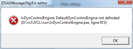 | Description | Hello sorry for my poor english When i try to execute this MessageDlg('Vous devez redémarrer votre ordinateur pour que les nouveaux paramètres soient pris ' + 0000013#10 + 'en compte' + 0000013#10 + '', mtConfirmation, [], 0) i have this error JvDynControlEngine: DefaultDynControlengine not definded (in JvDynControlEngine.pas, ligne 973) With Delphi 2007 or XE2 on Windows 7 64 and Xp | ||||