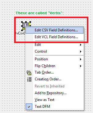 | Description | The original JvCsvDataSet had code for designtime Verbs (right click on a non-visual component and you get a series of commands in the menu). This stuff got zapped at some point in the past, and is now being reinstated. | ||||