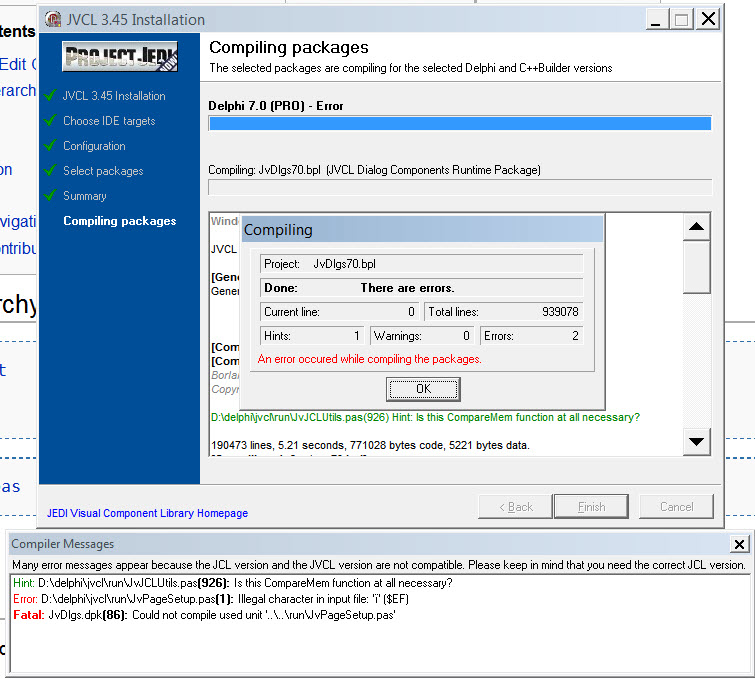 | Description | I just downloaded JVCL345CompleteJCL231-Build4197.zip I unzipped the ZIP, then ran the install.bat files for the jcl and the jvcl. The former installed fine. The latter, simply does not work. Regardless of the components I select to install, the following error occurs during the compilation stage of the installer (see 'additional info') Someone has a garbage character in the jvcl\run\JvPageSetup.pas file | ||||