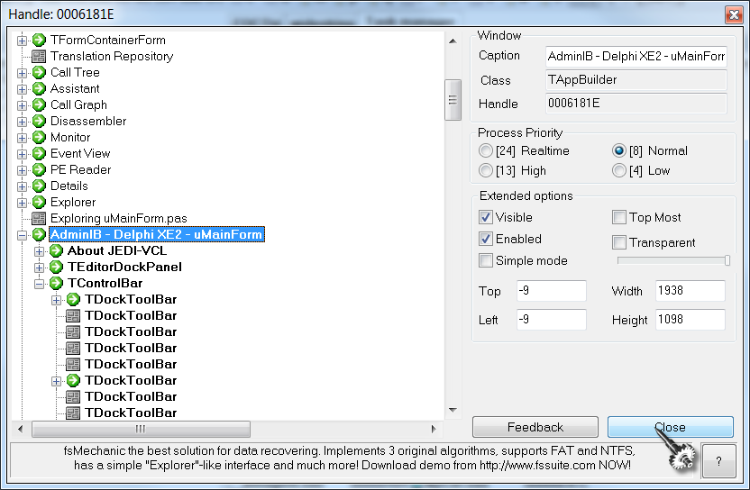 there were plugins for WinCmd to enable/disable windows... http://wincmd.ru/plugring/tiptop.html http://wincmd.ru/plugring/procfs.html I used ProcFS to scan BDS.exe The window focused on screenshot was disabled. After i re-enabled it, the IDE was normal. Until i launched the About box again Microsoft Spy++ also shows WS_DISABLEd style, but does not allow to undo it |