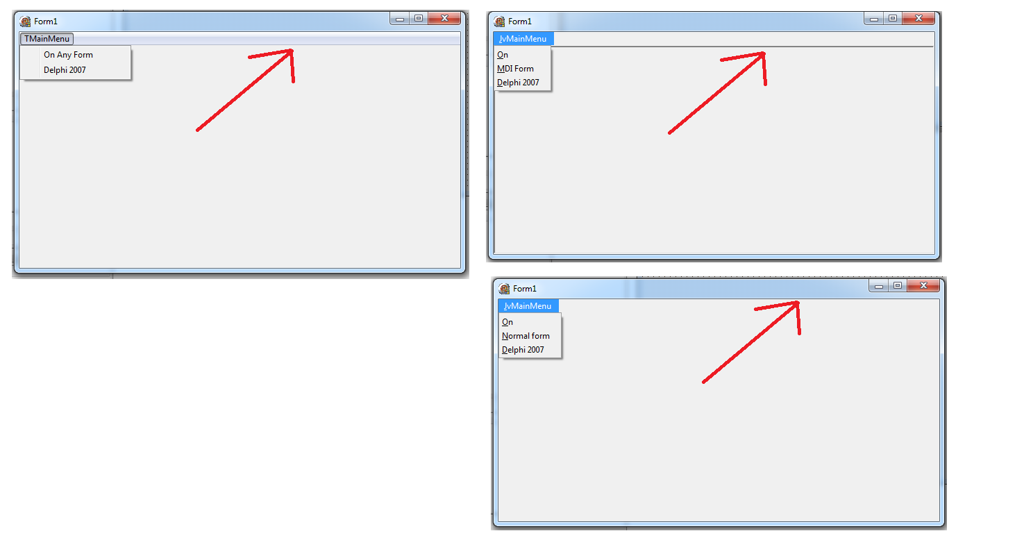 | Description | Can“t make the JvMainMenu look like the native TMainMenu Style On Delphi 2007. If the FormStyle = fsNormal, the JvMainMenu appears to be part of form. If the FormStyle = fsMDI, the JvMainMenu appears like a flat bar. I remember using previous versions of the component and being able to use the JvMainMenu with the Delphi 2007 native TMainMenu Style. Tried on a fresh delphi installation and the problem continues. There is a picture attached to illustrate. | ||||
